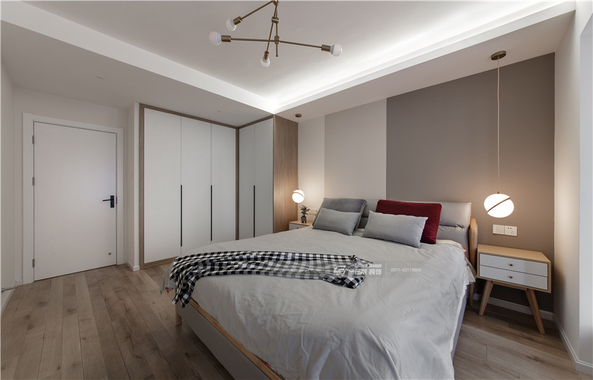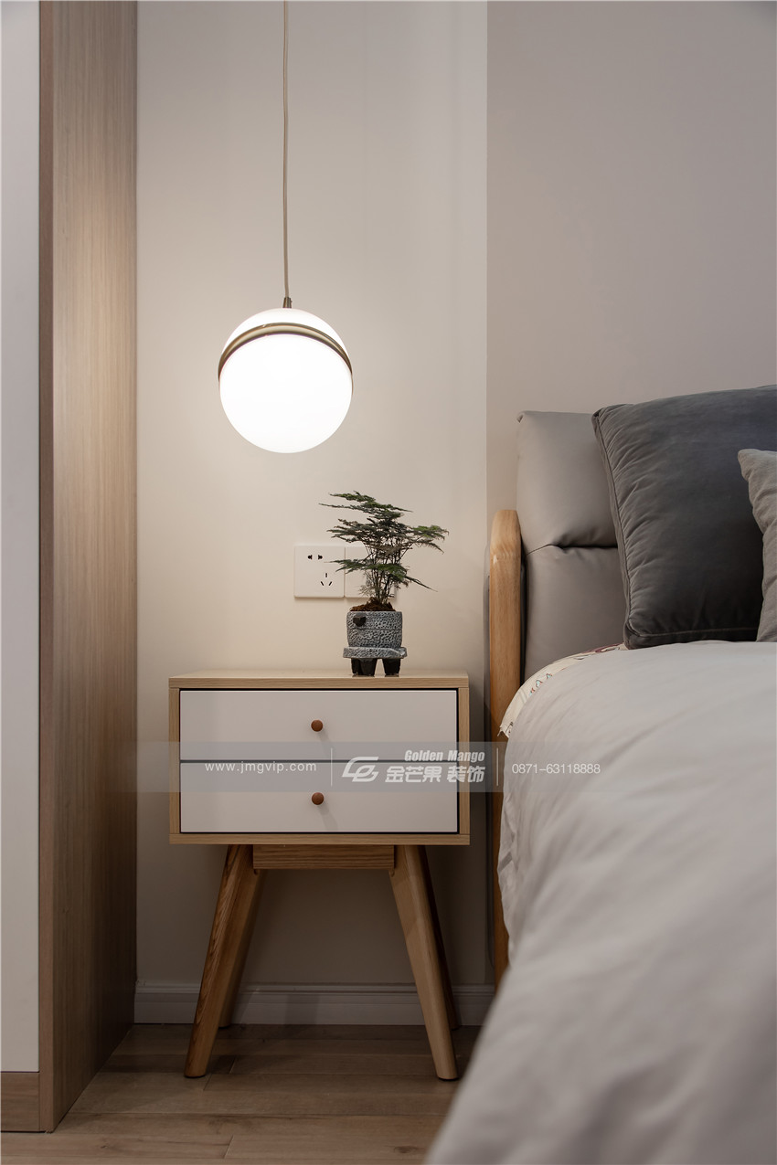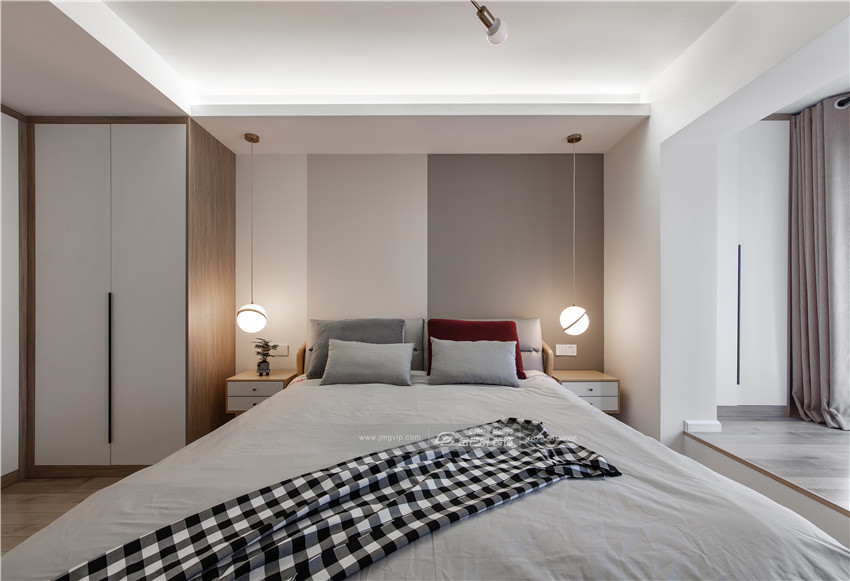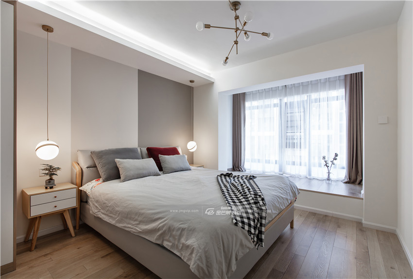 主臥室也是柔柔的北歐風,但區別于客廳清新的色調,臥室選用的是充滿暖意的顏色,整體搭配木質的地板,呈現氣質、暖意融融的感覺。