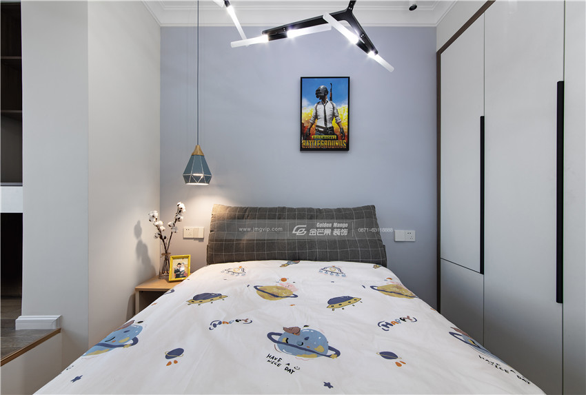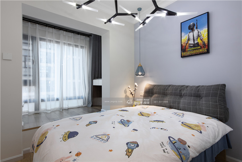 擁有一個和別的小朋友一樣酷酷的臥室,設計師幫小寶貝規劃到了。采光良好的飄窗既可以是小朋友的玩耍區域,也可以是學習區域。充滿個性的吊燈,酷酷的裝飾畫,這下,我們也擁有和別人一樣酷酷的臥室啦。