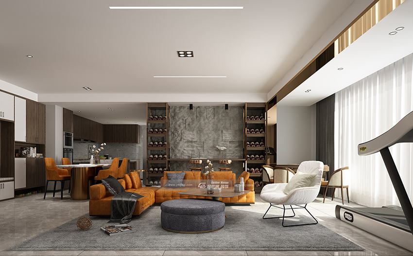 以風鳥為伴,以草木為家,仿原始建材的沙發背景墻,將大自然引到家里,更添自然、慵懶的味道。金屬材質的酒架家具和皮革的沙發,碰撞出摩登、時尚的韻味,讓家在時尚、慵懶之間自由切換。