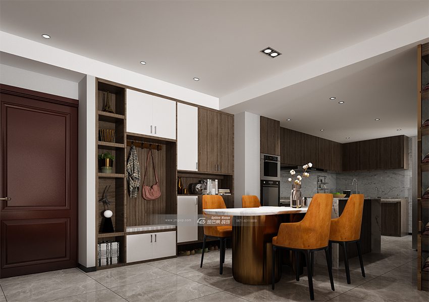 深色木質柜體和和大理石的結合,愜意又高級,和客廳呼應的餐桌椅顏色,讓空間不會顯得過于冷淡,明媚有格調。