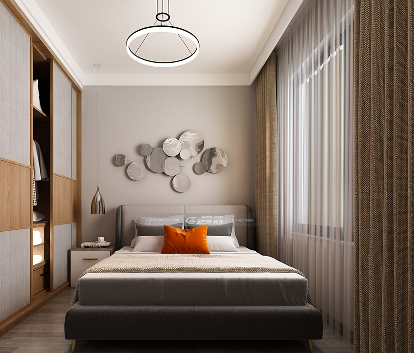 床頭的燈飾和橘紅色的抱枕,明媚自在又靈動。