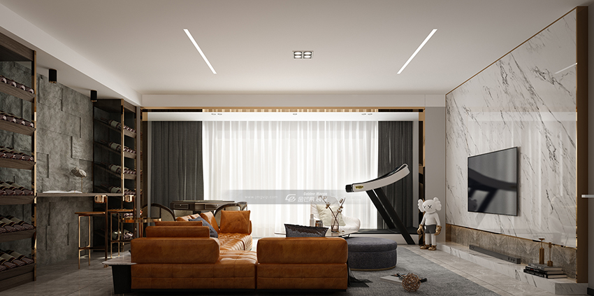 大理石電視背景墻,高級有格調,且和沙發背景墻的材質形成對比,形成豐富的空間層次感。