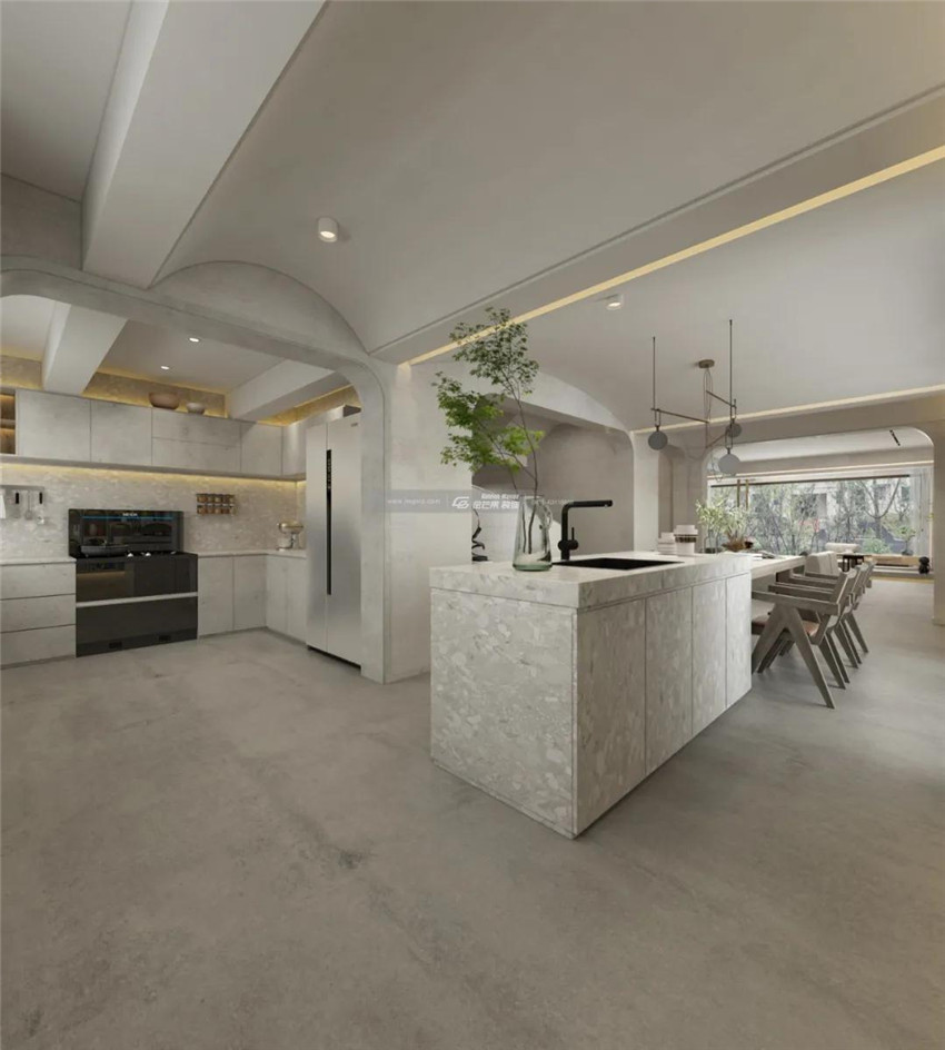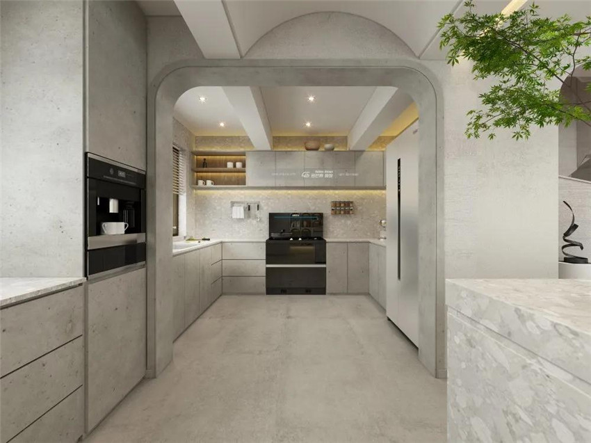 弧形元素在空間中被大量運用,弱化空間棱角。柔和與冷冽的融合。柴米油鹽,人間煙火,看似無色,卻勝過萬千繁雜。