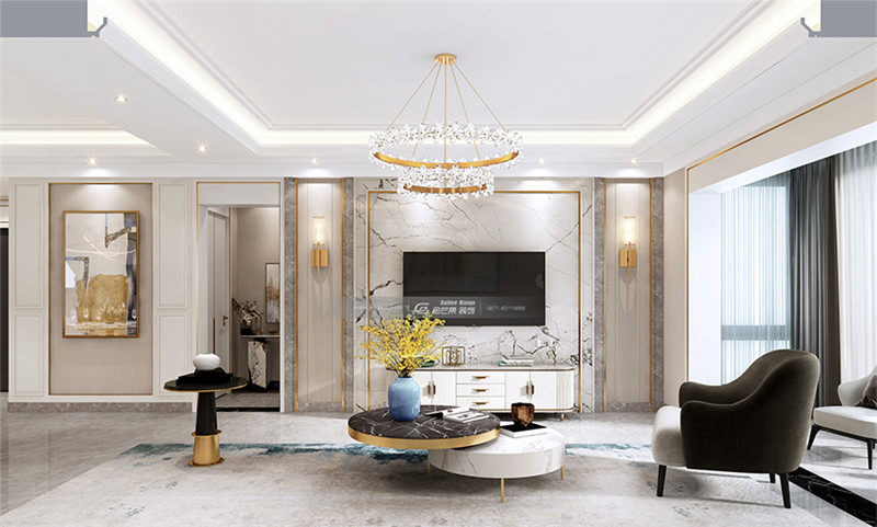 大理石電視背景墻加上,金屬線條和華麗的燈飾,舉手投足之間充滿了儀式感。