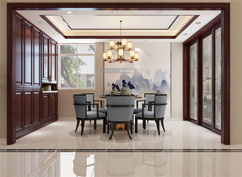 依然是紅木元素,營造雅致的新中式氛圍,用裝飾畫點綴,配合同色系的雅致餐桌椅,打造婉約、雅致的感覺。