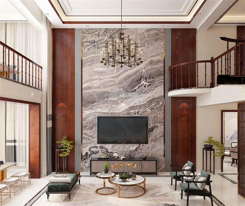 挑高的電視背景墻,兩邊的紅木營造典雅的氛圍,彰顯對稱美,加入金屬線條,營造奢華的感覺,但又不顯得張揚。