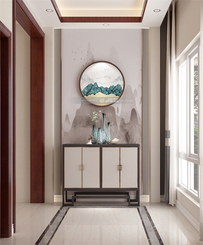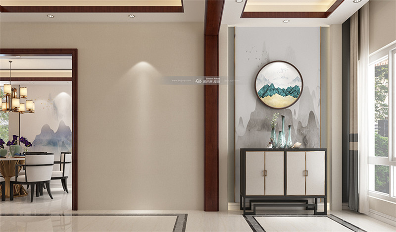 清新、婉約的玄關,中式的柜子和水墨裝飾畫自成一方風景,新中式的美在每一個角落彰然顯現(xiàn)。圓的儀式感和瓶子的意境結合在一起,讓新中式的美不流于表面,而是融入到整個意境當中。