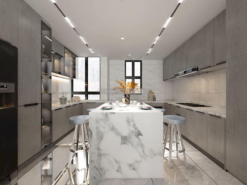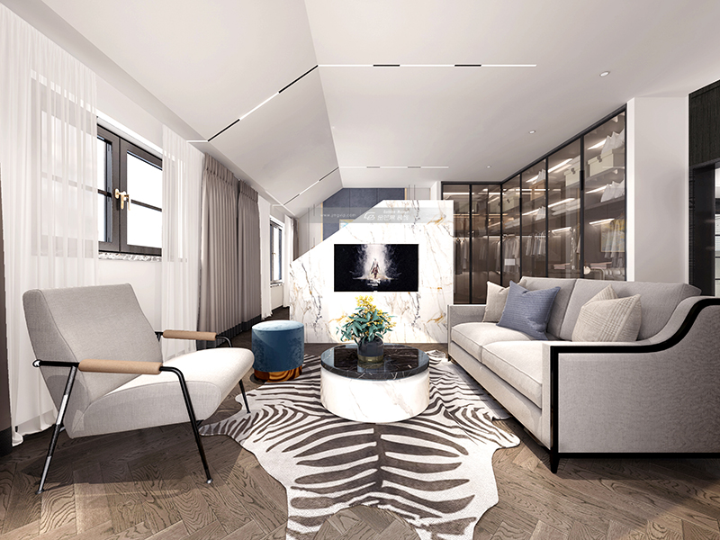 通過灰色木質墻板,藝術涂料,大理石材質使整個空間充滿現代極簡藝術的氣質,細節上質感十足。燈光上運用大量的線性光,點光源,即營造出空間的氛圍感,同時也增加了畫面構成的設計感。