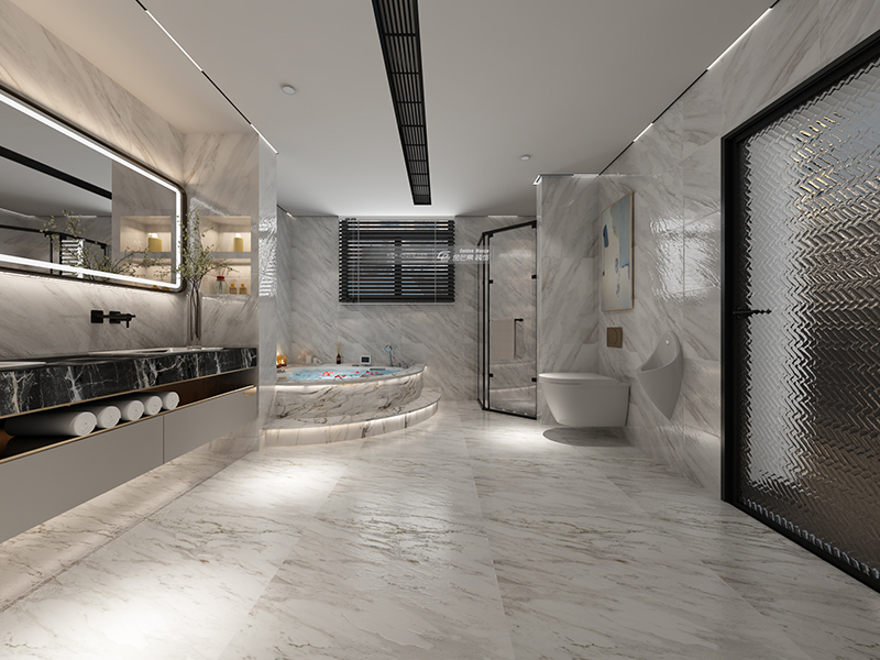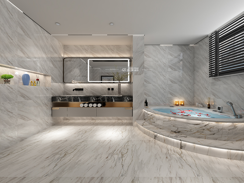 大理石鋪貼,通透清麗的材質干凈、優雅,浴缸的設計讓入浴變成了一種美妙的享受。寬闊的浴室空間猶如一首悠揚浪漫的歌,在歌里盡情享受格調生活帶來的美妙體驗。