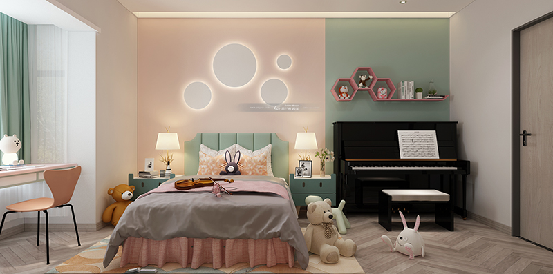 清新、靚麗的配色,給孩子一個絢麗的童年,可愛的燈飾不規則的造型讓空間充滿活潑、童趣。整體空間是純凈、甜美的風格。