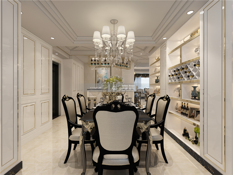 鑲金度邊的餐桌椅和餐邊柜,用精致的細節點綴,營造儀式感滿滿的歐式風情,精美的餐具,搖曳的紅酒,華麗的燈飾,為屋主營造一個浪漫的秘密花園。