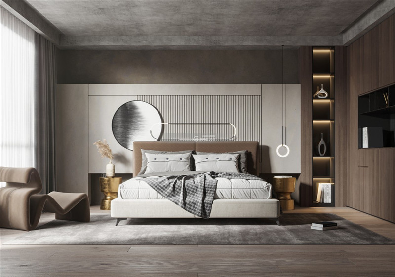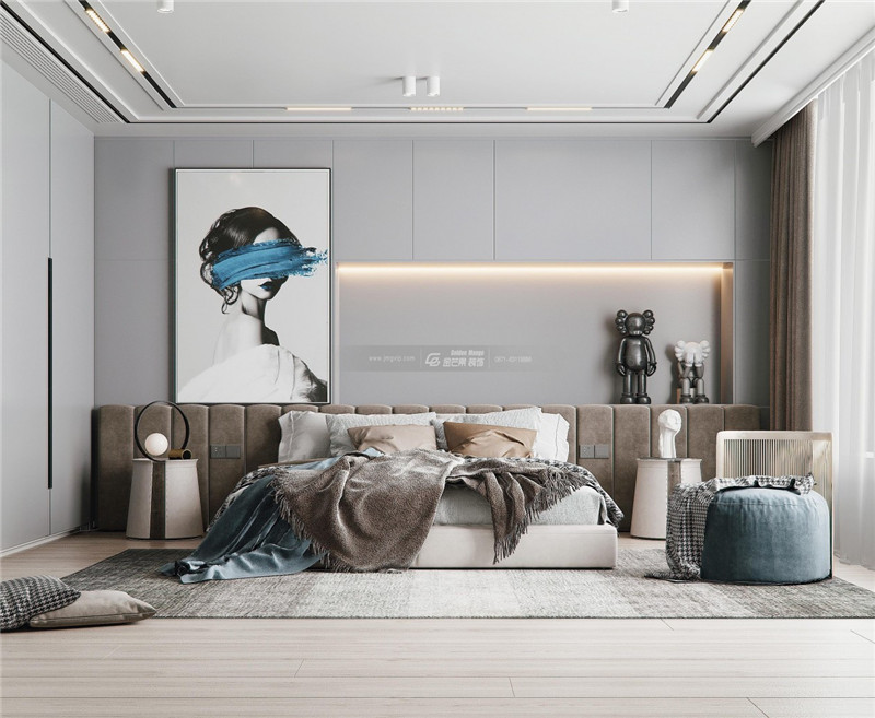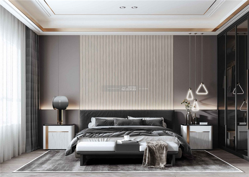 用精致的燈飾和簡(jiǎn)約金屬材質(zhì)點(diǎn)綴其間,對(duì)比之間碰撞出個(gè)性氣質(zhì)的藝術(shù)家居氛圍。沉靜的顏色適合舒睡。