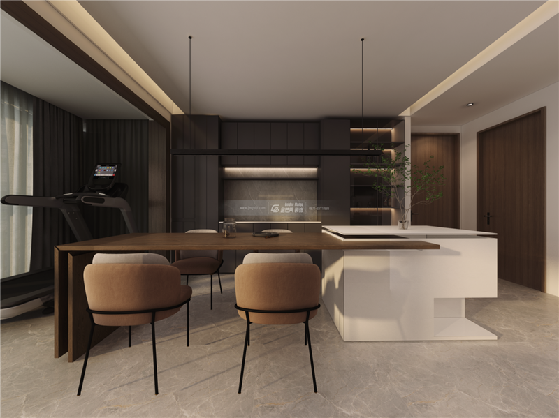 陽臺采用封窗處理并留出男業主健身活動區域,設置餐桌椅,既可以用餐,也可以品茶,讓空間帶來更多互動。