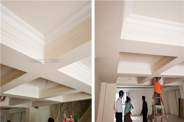 別墅戶型復(fù)雜的吊頂造型,木工師傅們也能完成得非常出色,細(xì)節(jié)處理等都十分精細(xì)。